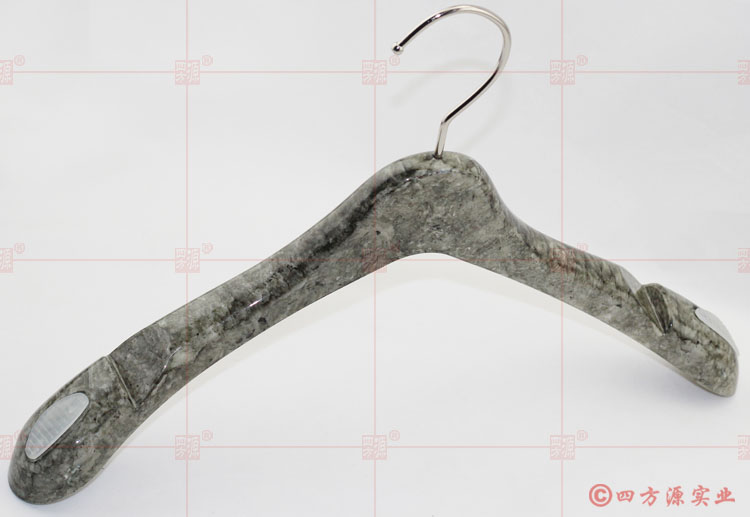 21221#塑料衣架是款十分优美和实用的女装衣架,两肩有宽大的加深V形坎和独特的弧形防滑PVC软胶片。防滑PVC虽然较一般长条形PVC短小,但因其位置按衣架的使用过程中的力学特性进行科学设计,且软度度作相应优化,所以防滑效果好。该款衣架主要用于品牌小码女装与大码童装。以下为高级大理石纹效果,欢迎个性定制!